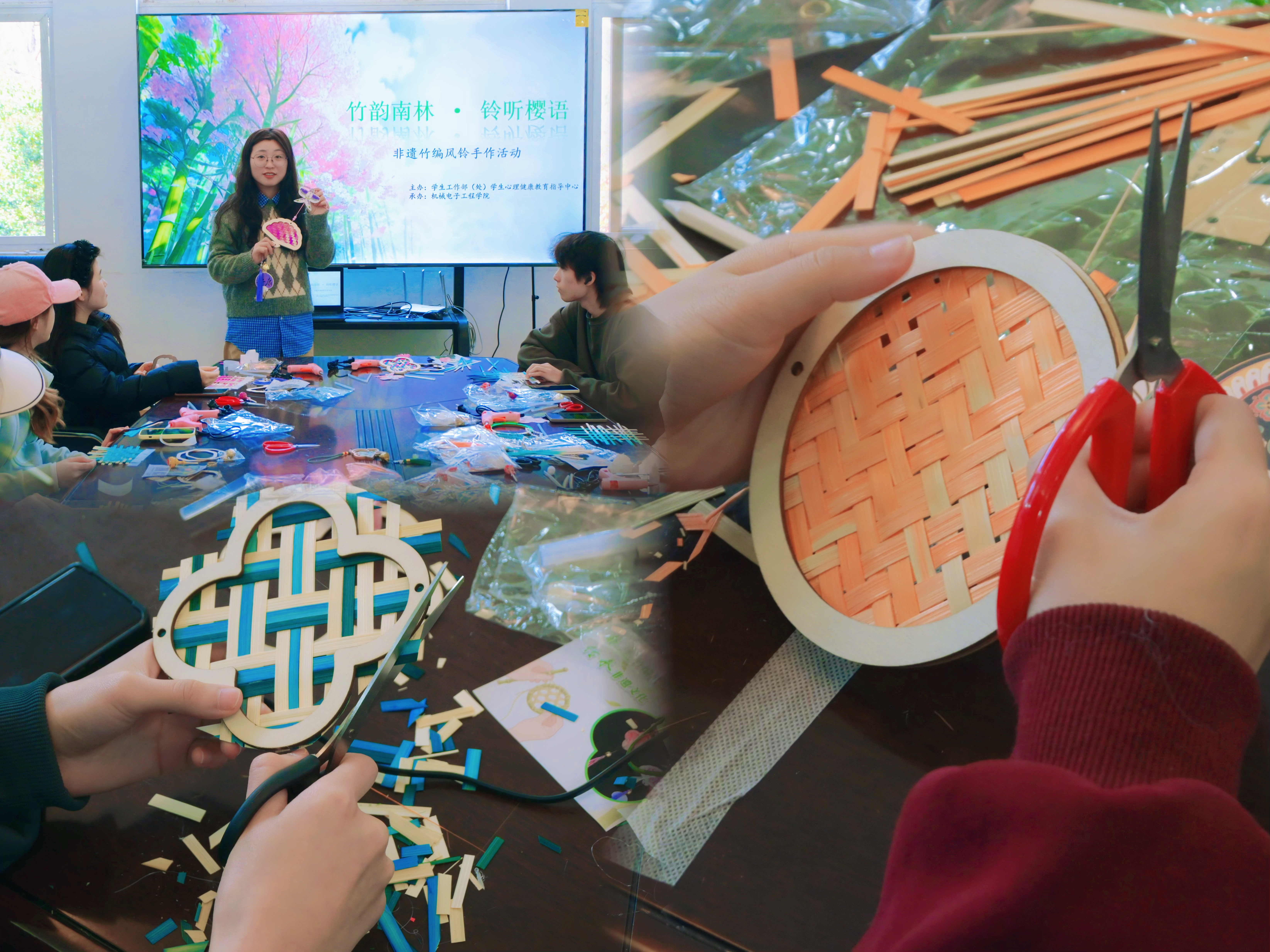 为深入推进大学生心理健康教育,传承中华优秀传统文化,引导学生感受生态之美、涵养平和从容心态,3月25日下午,由校心理健康教育指导中心主办、我院承办的“竹韵南林•‘铃’听樱语”非遗竹编风铃手作体验活动,在机电院3222室顺利开展。活动吸引了30余名学生参与,在竹篾交织间感受生态之美、非遗之韵与心灵之安。