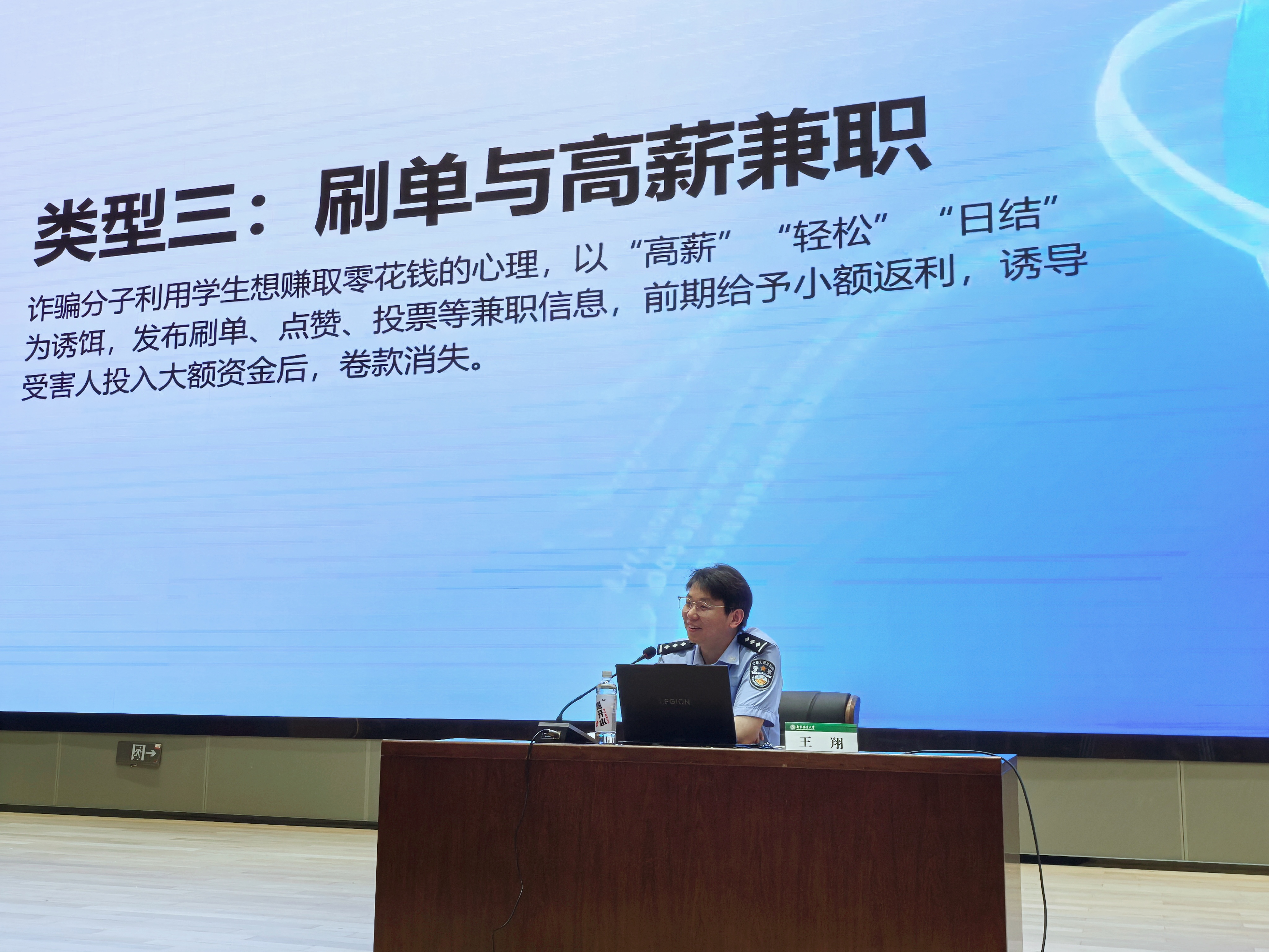 会上,王翔警官围绕“智护青春·机警诈骗”和“防范于心,反诈于行”主题,结合当前高校电信网络诈骗发案特点和校园诈骗新形势、新套路,深入剖析冒充熟人、虚假购物、刷单兼职、手机被控等校园高发典型诈骗骗局,通过真实案例还原诈骗手法,提醒学生牢记“三不一多”原则,主动下载国家反诈中心APP,全面提升识骗、防骗、拒骗能力,筑牢个人财产安全防线。